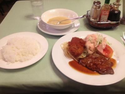 メインは牛ロースステーキとエビクリームコロッケという、また洋食屋の人気者ふたりがタッグを組んだ顔ぶれ。