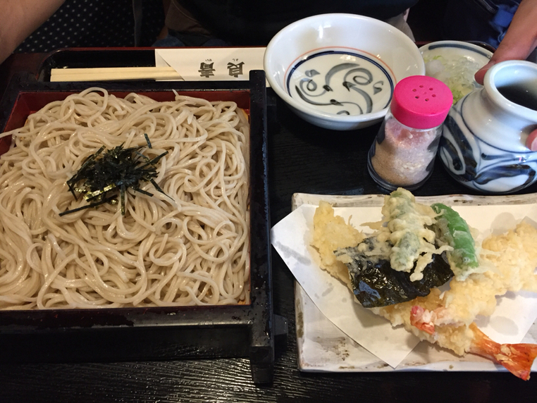 天ぷらそばは、えび、しそ、のりがのってます。出汁からいくと、んー、すこし味が、関西出汁に慣れてる私には辛めかな。醤油の味が強い感じ。