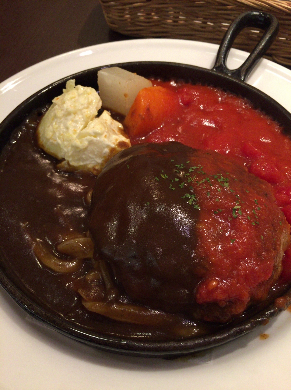 さて、ハンバーグは、すごく柔らかくて、ふわふわ。歯ごたえのある肉、というよりは、練りこまれて柔らかくなったお肉が肉汁もしっかり含んでジューシーな感じ。