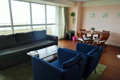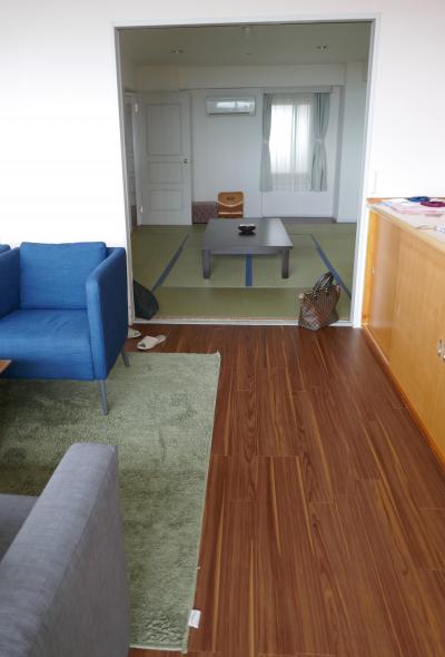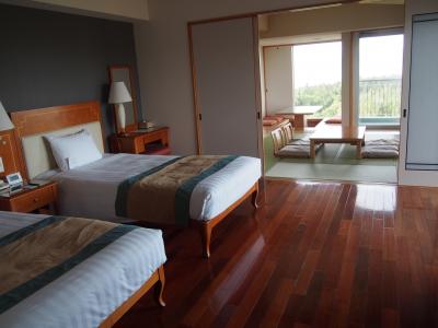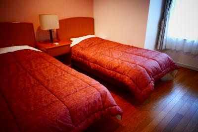 お部屋は広いリビングルーム、キッチン、10畳和室、ツインのベッドルームのリゾートマンションのような作りで、2人宿泊にはもったいない広さ。