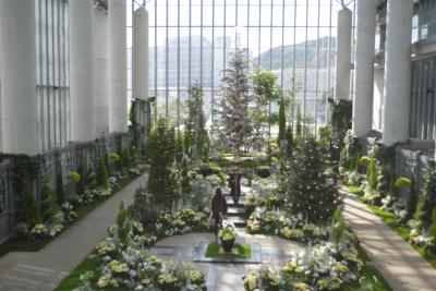 季節ごとに、たとえばクリスマスの時期は大きなクリスマスツリーといった、変わる大きな温室がまずは目立ちます。
