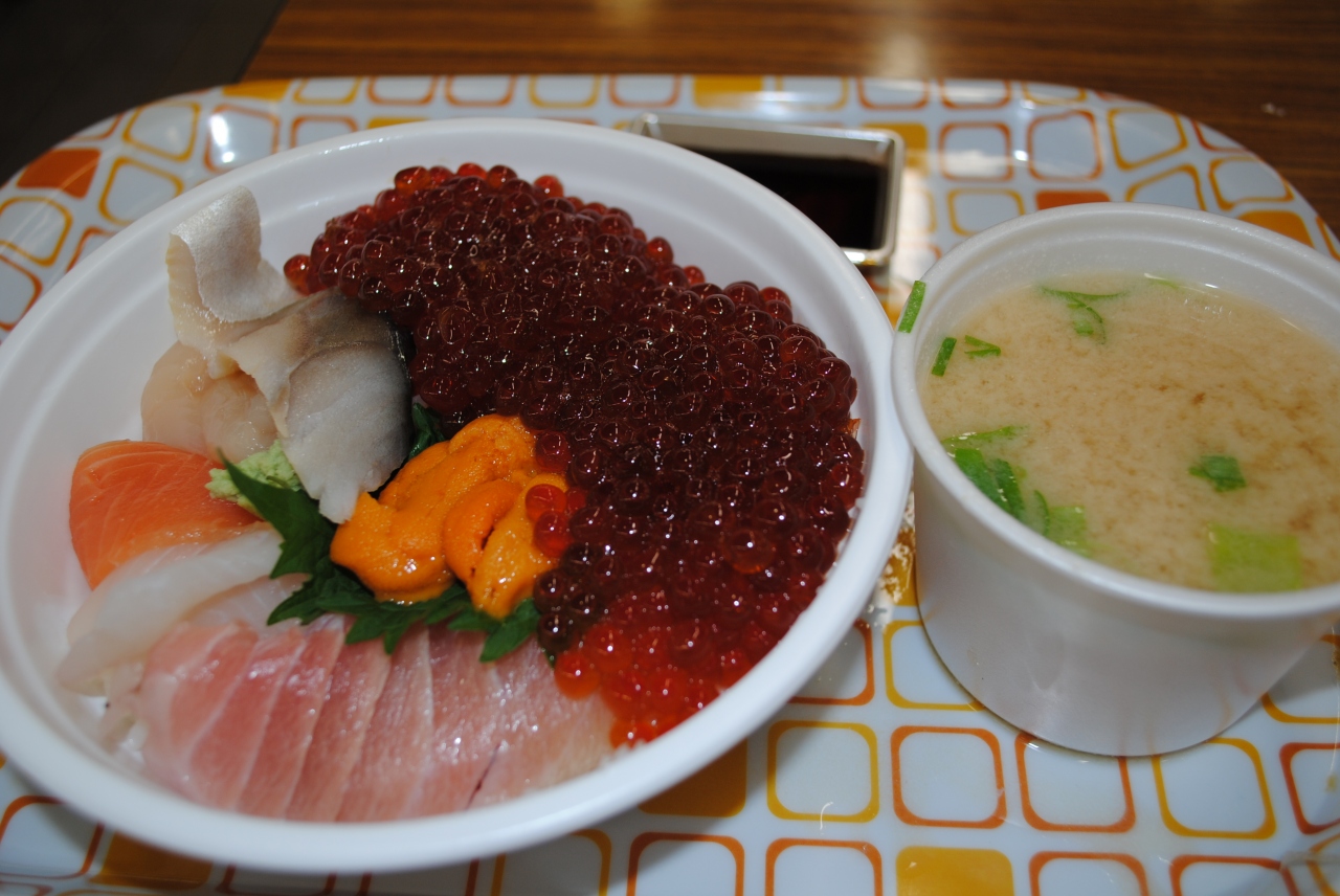 ここの名物といえば勝手丼ですが、まずはごはんを購入し、各お店でお魚などをごはんの上にのせていき食べるというスタイル。