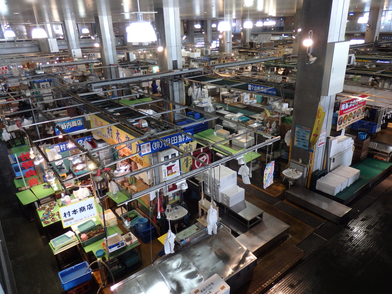 1階が市場となっていまして、フグをはじめとする海鮮物や総菜を売る店などがたくさん並んでいました。