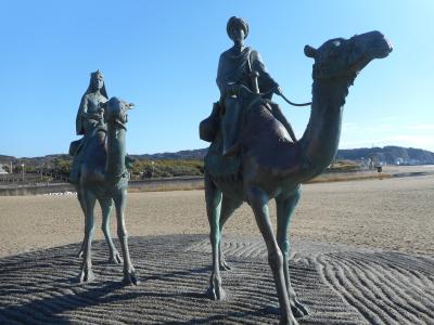 月の砂漠記念館の前には小川があって、その向かいに砂浜が広がっていて、すぐに月の砂漠の銅像を見つけることができます。童謡「月の砂漠」で出てくる2頭のラクダに乗った王子と姫をあしらった像が砂浜上に置かれているのですが、ちょうど砂浜が砂漠のように見えるので、それなりの雰囲気は感じますが、銅像以外に特に目立ったものはありません。