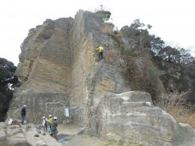 また、この山はロッククライミングの聖地ということもあって、岩場のあちらこちらにハーケンの跡が付けられていて非常に独特なビジュアルでした。そして、山頂真下には大きなスペースもあり、ロッククライミング愛好家や市民で賑わっていて、少し追浜方面に降りると、大きな磨石仏がありました。
