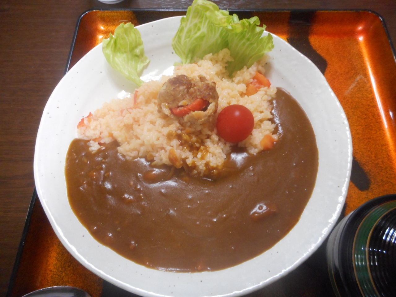 ここのトマトカレーの特徴は、ライスにトマト入りのバターライスが使われていること。また、トッピングにも、ミニトマトの他、トマトを包んだミニハンバーグが乗っているということ。カレーは、普通の味でしたが、確かにトマトで彩られたトマトカレーでした。