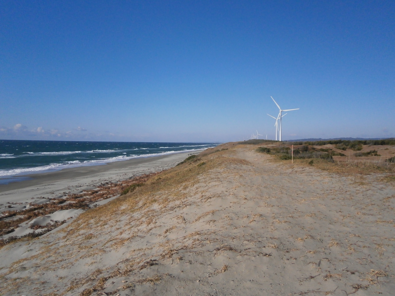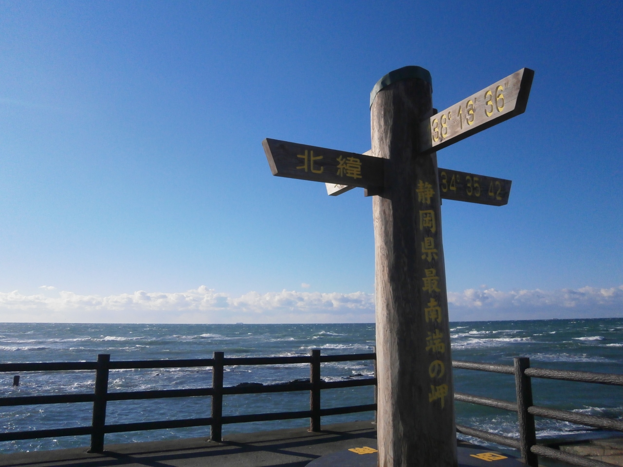 海岸線沿いにある駐車スポットの近くに、御前崎と記された指標があり、そこから雄大な太平洋を見ることができます。- 旅行時期