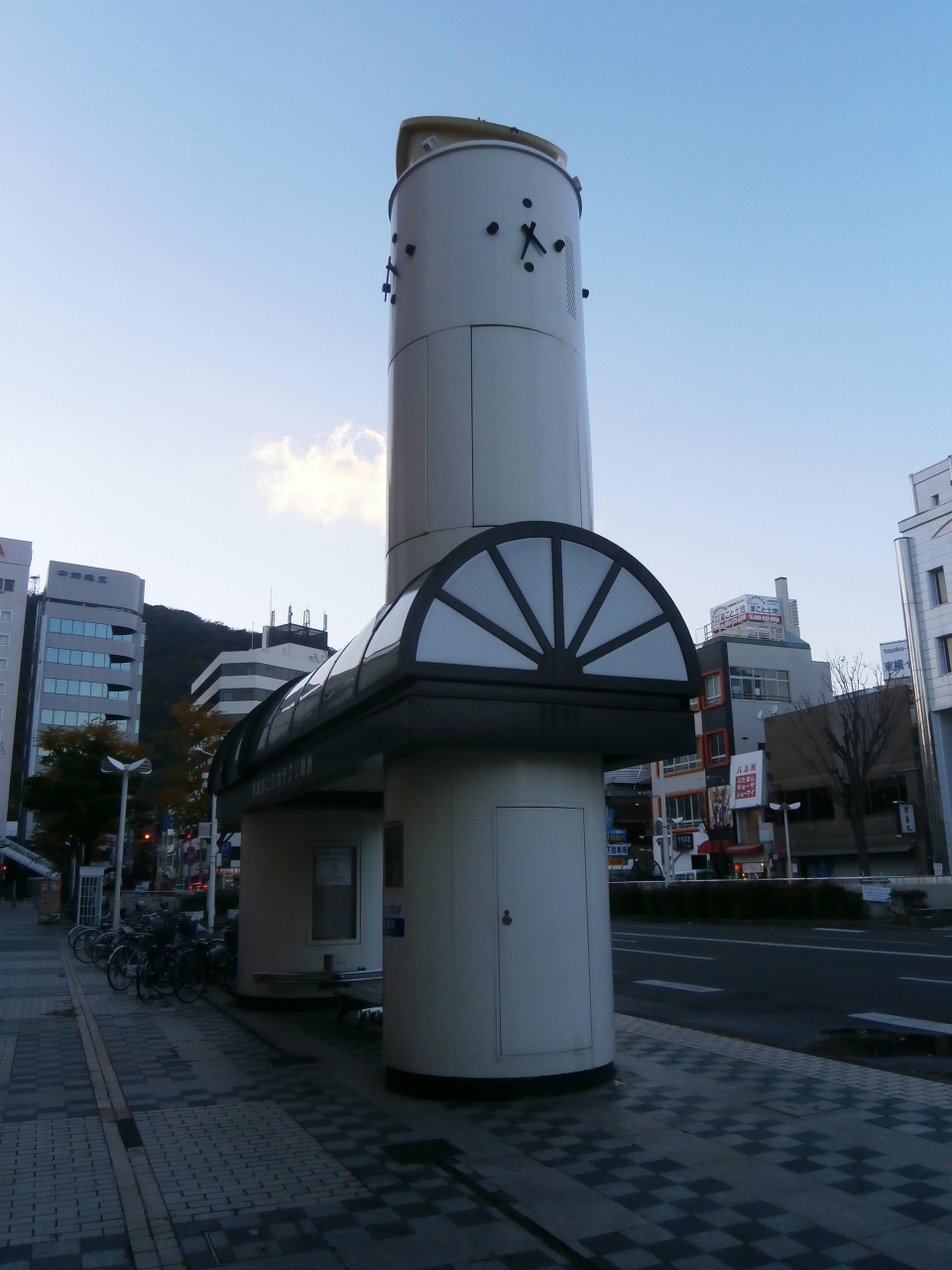 一瞬からくり時計はどこと思いますが、よくよく見てみると、バス停の屋根の上にありました。