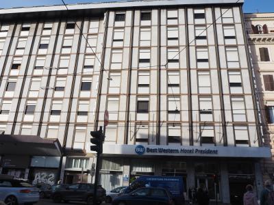 ベストウェスタンは、地下鉄の駅をおりてすぐの大規模チェーンホテル。直前でも比較的リーズナブルな価格で予約が取れました。近代的で綺麗なホテルです。ビジネス利用客も多そう。一番角部屋で、眺望はありませんが、広く、静かで、快適に過ごすことができました。朝食会場はきれいで広く、気持ちよく食事できました。食事のメニューも豊富で、はずれなくおいしいです。今回のイタリア旅行では、ここしかないというものが、2つありました。まず、焼きたてのパンケーキやワッフルがそろっていること、そして、コーヒーも、マシンではなく、手で淹れたものです。朝食は間違いなく★★★★★。プロセッコのボトルも冷やされていましたが、飲んでいる人は見かけませんでした。