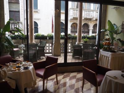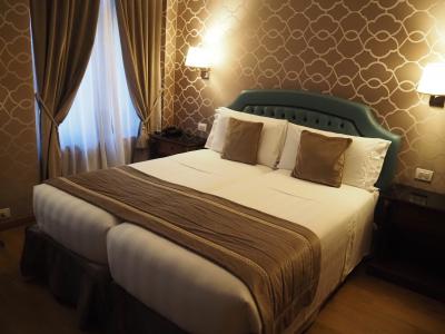 サンマルコ広場から徒歩2分の好立地にある老舗ホテル。こじんまりとしていて、やや古い印象を受けますが、内外装ともシックで清潔感あり、いかにもベネチアらしい歴史を感じるホテルです。部屋はそれほど広くありませんが、デスクや椅子も設置されていて、くつろげます。朝食はコンチネンタルですが、