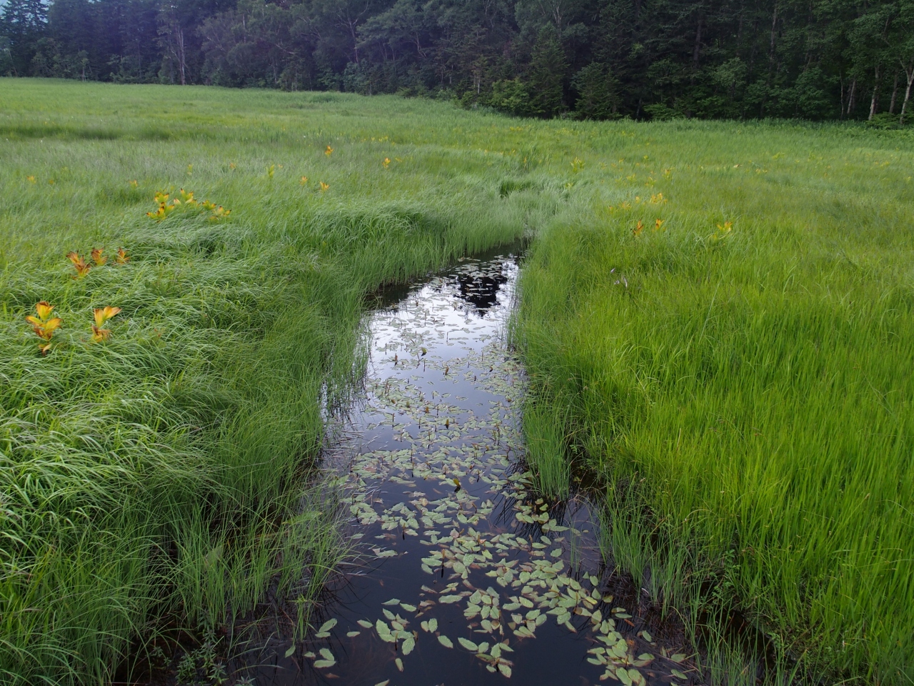 尾瀬沼・長蔵小屋から三平峠方面に歩くこと約10分。森林帯から視界が開けたところにあります。近くにある大江湿原に比べると、規模は小さく、通過するのに、3分とかかりません。小川が流れており、高山植物も豊富で、絶好の写真撮影のポイントです。