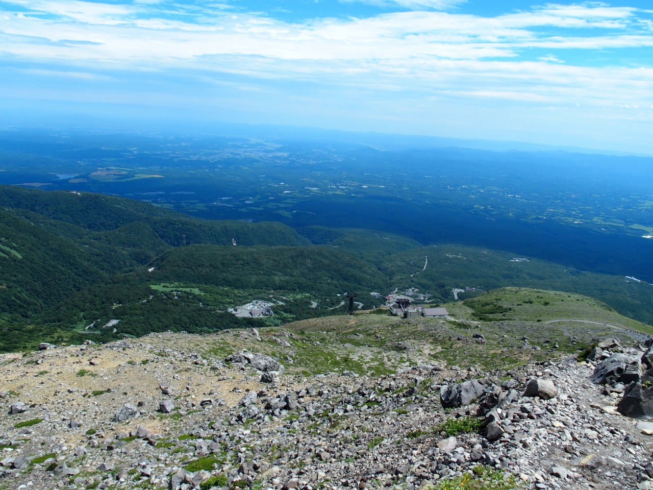 那須岳ロープウェイの山頂駅から、登山道を50分登ると山頂に到着。途中の登山道は、よく整備されており、あるきやすいので、家族づれも多く見かけました。山頂からのながめは最高です。那須高原や、八溝山地、白河、須賀川、郡山などの市街地が一望できます。