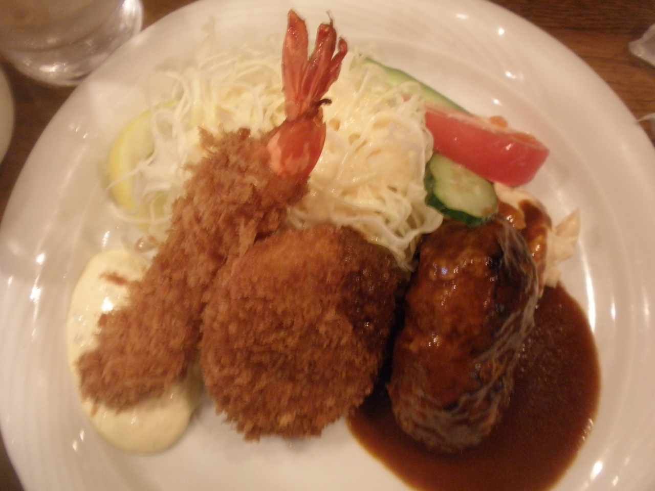 ランチ時でしたので、10名ほど順番待ちで、40分ほど待ちました。店内は小さいので回転はあまりよくありません。並んでいるときに注文を取りにきました。ハンバーグ、海老フライ定食を注文。ライスとスープ付き。スープはお代わり自由。海老フライは意外に大きく、ハンバーグも油濃くなくさっぱりとした仕上がり。御飯の量も多く、並んだかいあり、満足しました。