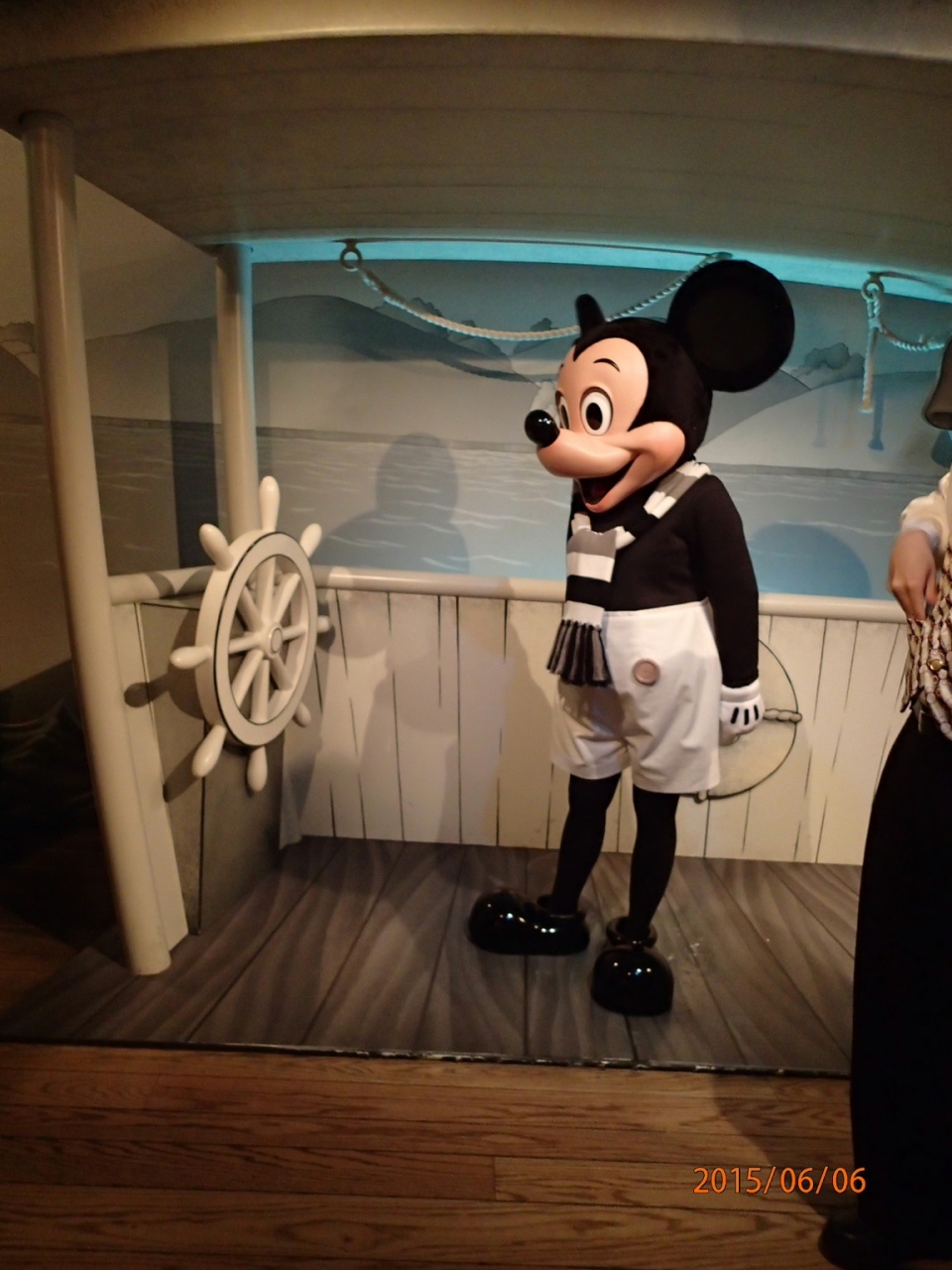 これまで何回かミートミッキーでミッキーにあっていますが、これまでは魔法使いと、いつものタキシードでした。こちらの蒸気船ウィリーの衣装は初めて!!でした。