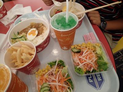 テーブルはなんとか確保できましたが、ゆかにトレーを置いて食べている人たちもよく見かけます。