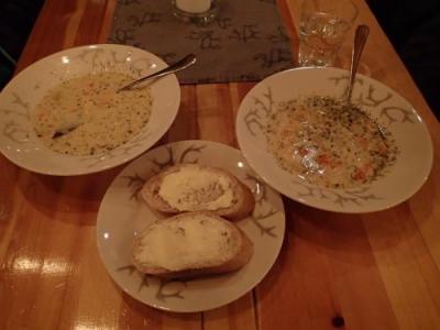 休憩と夜食です。夜食は評判のサーモンスープ!とてもおいしかったです。
