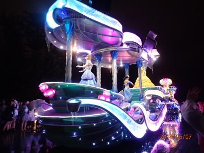 「ナイトフォールグローウー♪」の音楽と一緒にフロート数台が流れてきます。寒色を基調にしたフロートでなかなか綺麗です。大人が綺麗と思う感じかも。- 旅行時期