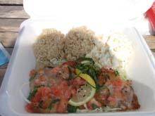 *アラモアナ・ビーチパーク*フリフリチキン、プレートランチを持って、近...