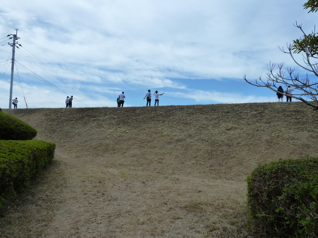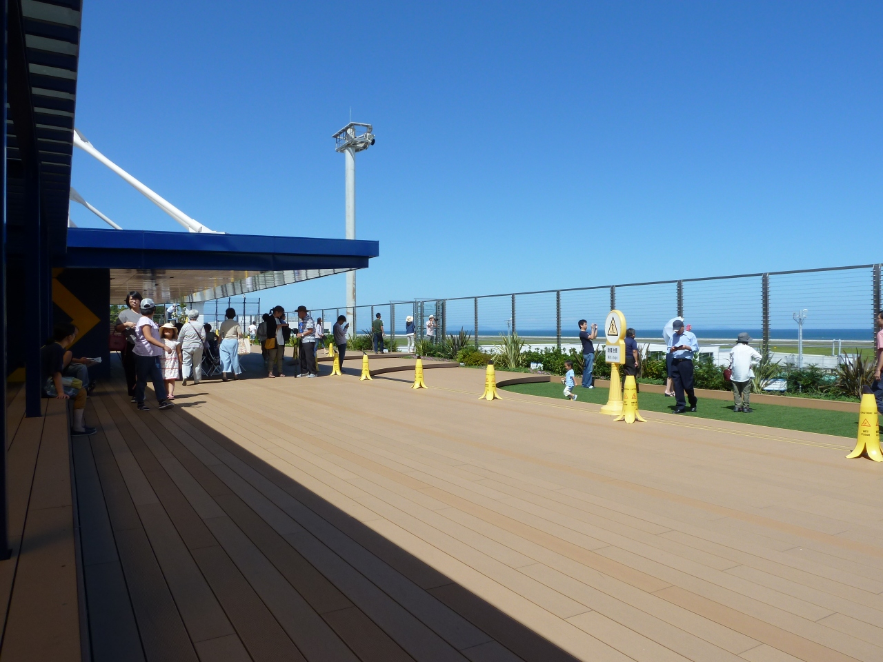 展望台では人が集まり皆オスプレイをみています。意外に小さい。端に止めてるので小さくしかみえません。それで空港を出て徒歩15分ほどの隣にある公園風・展望台風の丘陵へ。ここはフェンスもなくゆったり見えます。人が集まって撮影しています。