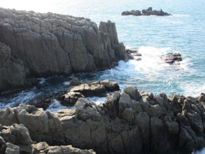 新世代新第三紀の火山活動でマグマが堆積岩層中に貫入して冷えて固まった火山岩が波に削られれて
