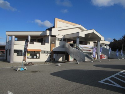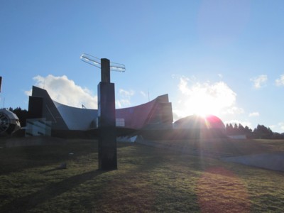 道の駅のとじまがありその向いの丘の上に建つ宇宙基地のような建物が美術館でした。
