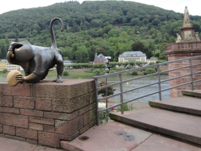 橋のたもとには、猿の像があって、手には鏡をもっています。