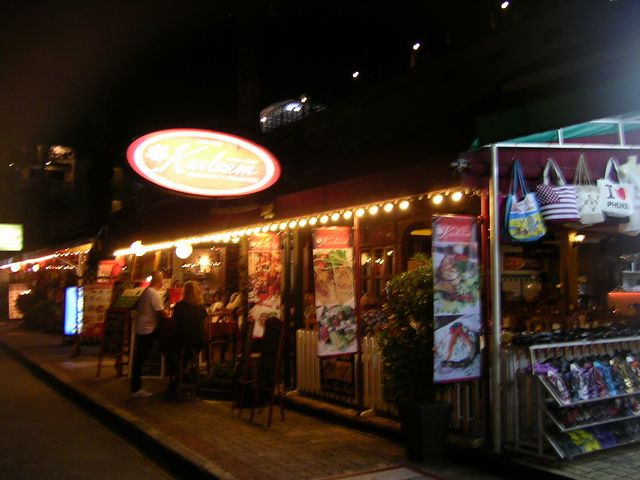 買い物は、カロンビーチ側の出入り口から出て、左(南)へ5,6分でミニマート。付近にマッサージ屋さん。右(北)に6,7分で、屋台が出ている小さな小道(ソイ?)その先2,3分で、トタン屋根のこれぞお土産屋街。さらにその先4,5分で賑やかなロータリー周辺に出られます。この辺は、レストラン/バー、(チープな)お土産屋、マッサージ屋がたくさんありました。