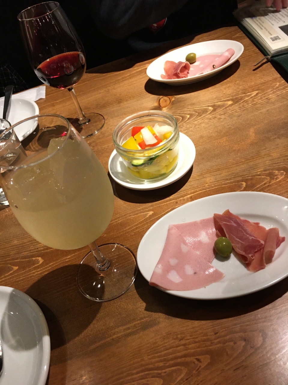 今回、ワインやサングリアを飲みながら、マルゲリータや秋刀魚と九条ねぎのアヒージョ、フライドポテト、ピクルスなどを食しました。