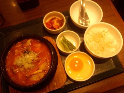 私は『スンドゥブチゲセット』をオーダー、辛めのスープですが、生卵が付いていましたのでまろやかになります。