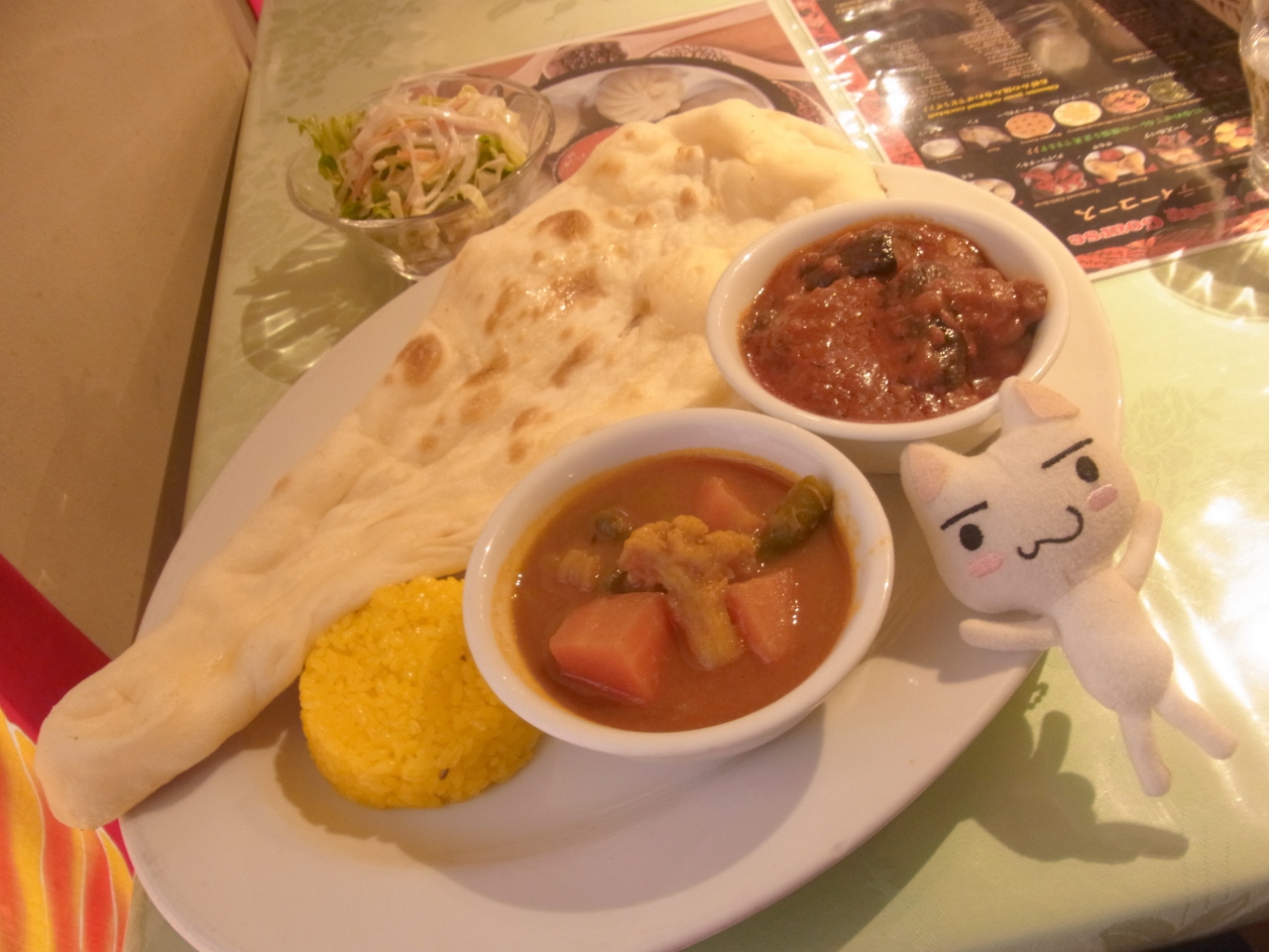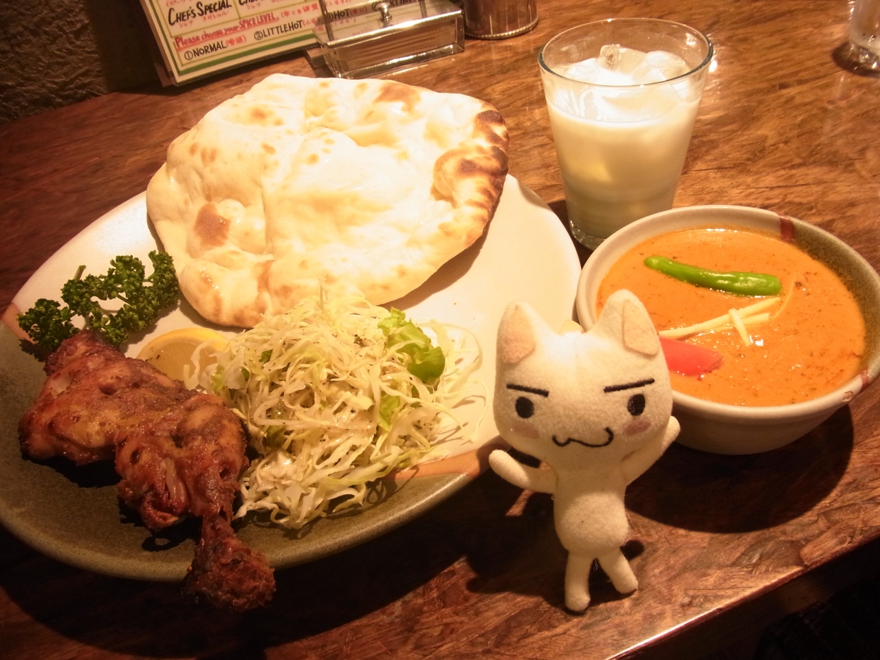 ランチメニューは何種類かあり、私はカレー1種類(チキンカレー)、ナン、骨付きチキン、サラダ、ラッシーが付いたセットを頂きました。チキンが少々ぼそぼそしていましたが、それ以外は普通に美味しかったです。