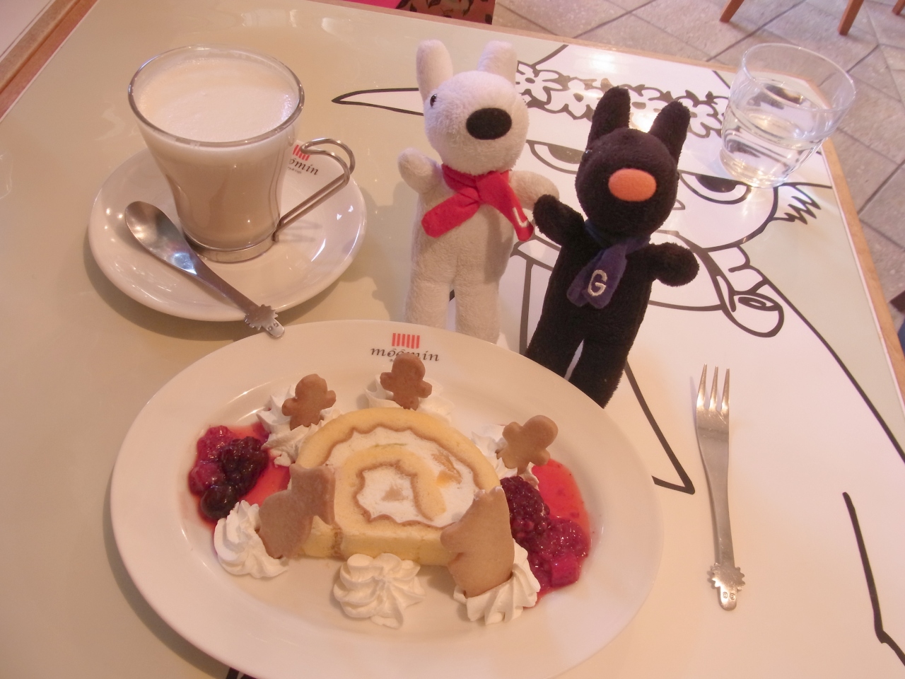 私がオーダーしたのは『ニョロニョロール』。クリームたっぷりのロールケーキの周りのにはムーミン、ニョロニョロ、スナフキンモティーフのクッキー...ファンにはたまりません。お味は普通に美味しかったです。カトラリーもニョロニョロです。