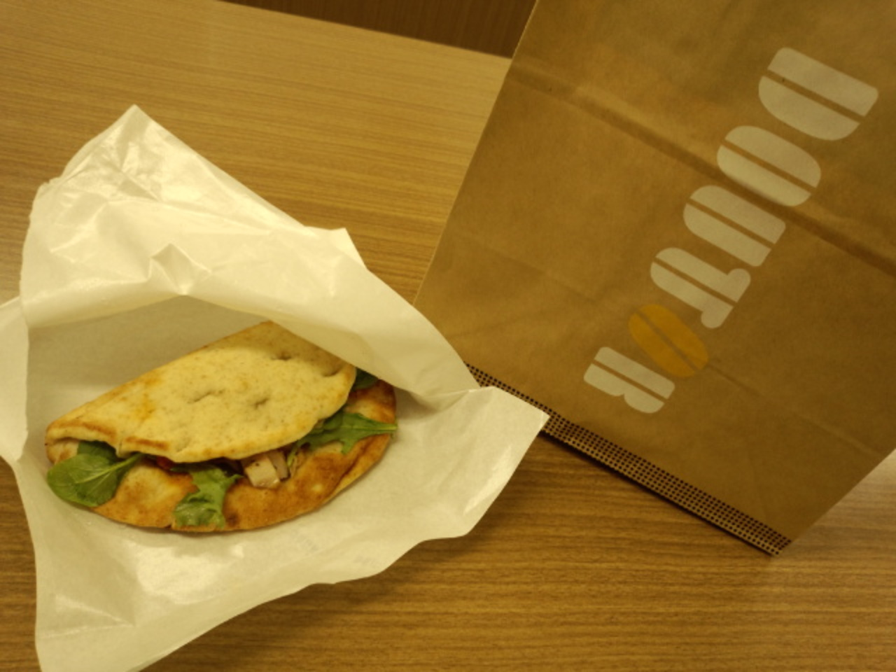 席が空いていなかったので、フォカッチャ風のパンにチキンが入ったサンドをテイクアウト、直ぐに出来上がりました。