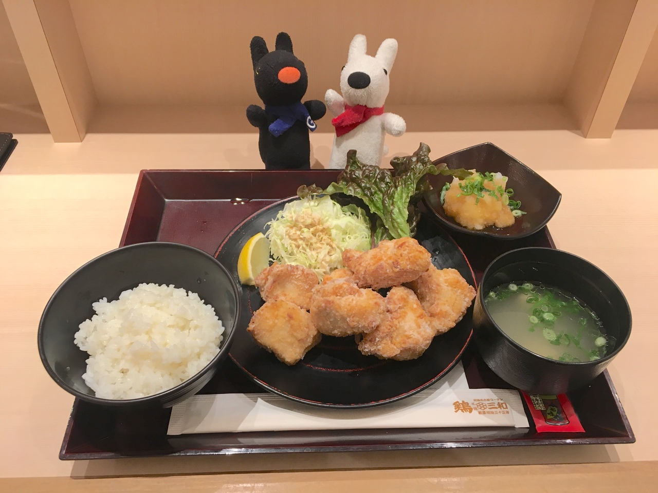 大きめの唐揚げ、ごまドレがかかった千切りキャベツとレタス、鶏のつくねが入った鶏出汁のスープ、レモン、大根おろしがセットになっていました。