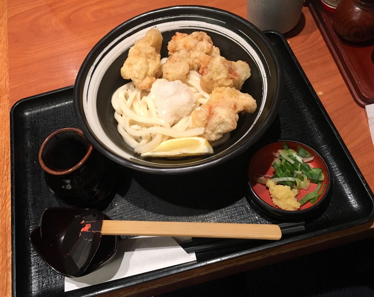 おうどん自体は美味しく、大きめの揚げたてのとり天がジューシーで、大根おろしと生姜、そしてレモンを絞って頂きますと、さっぱりします。- 旅行時期