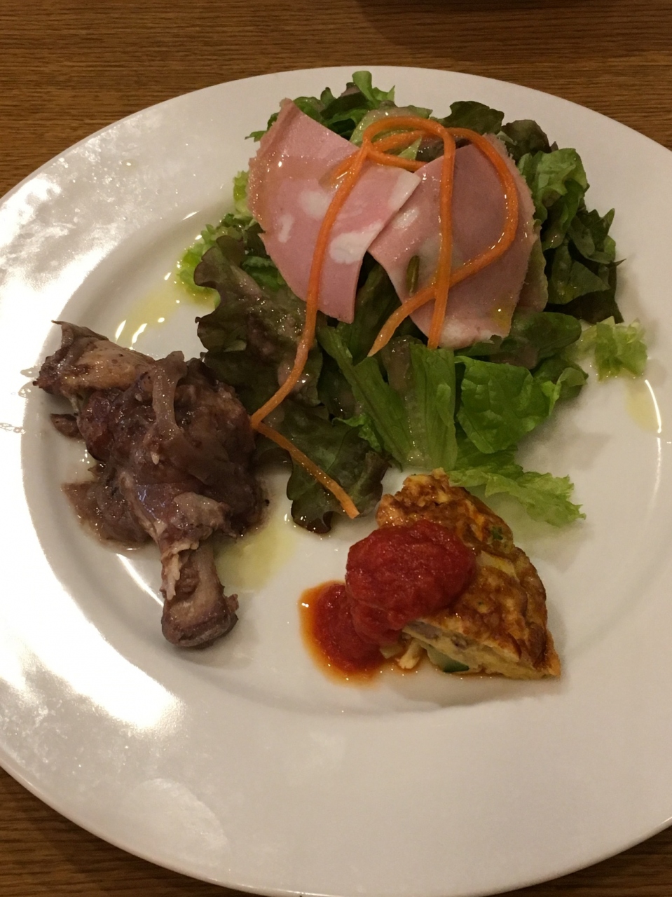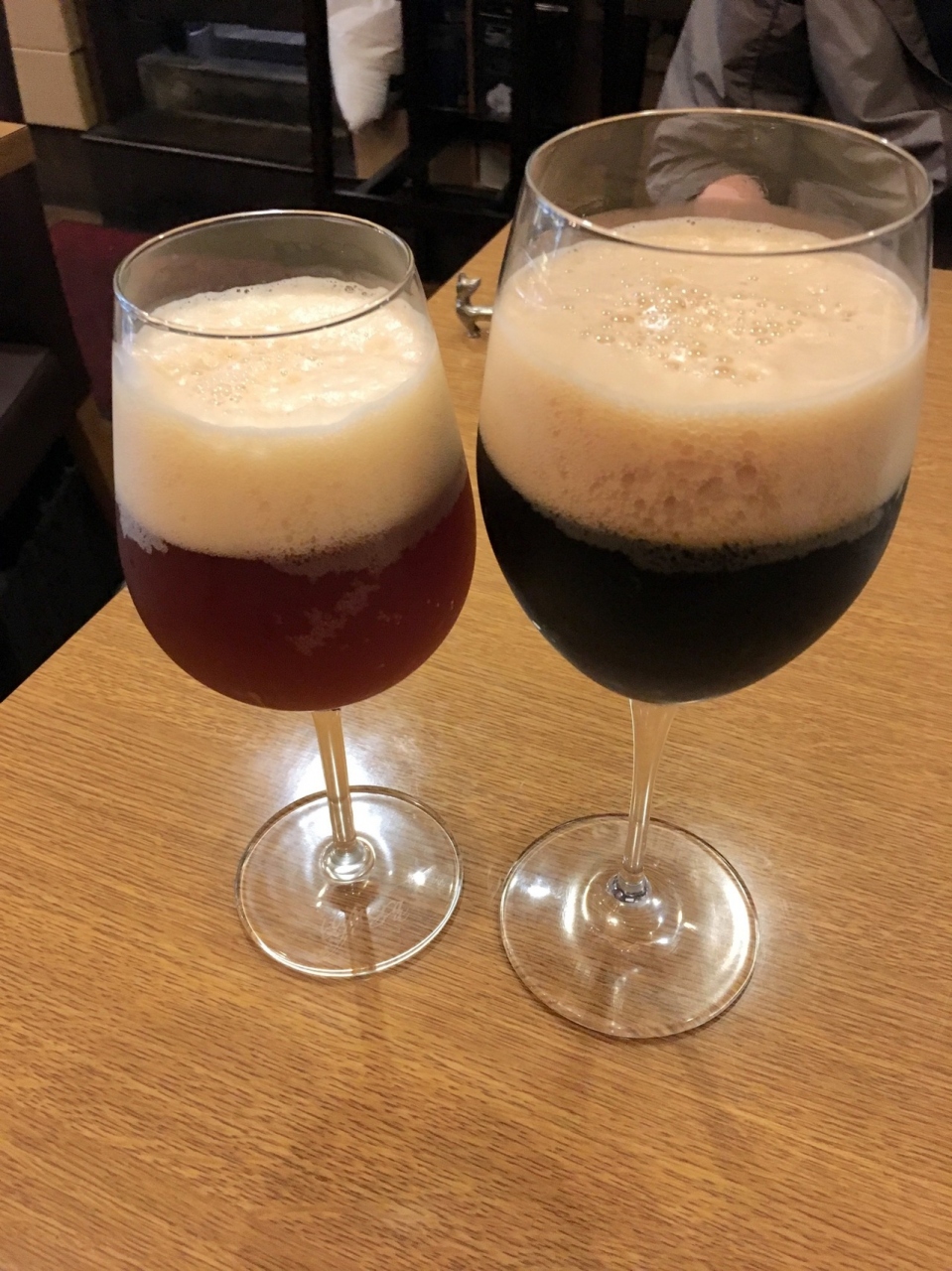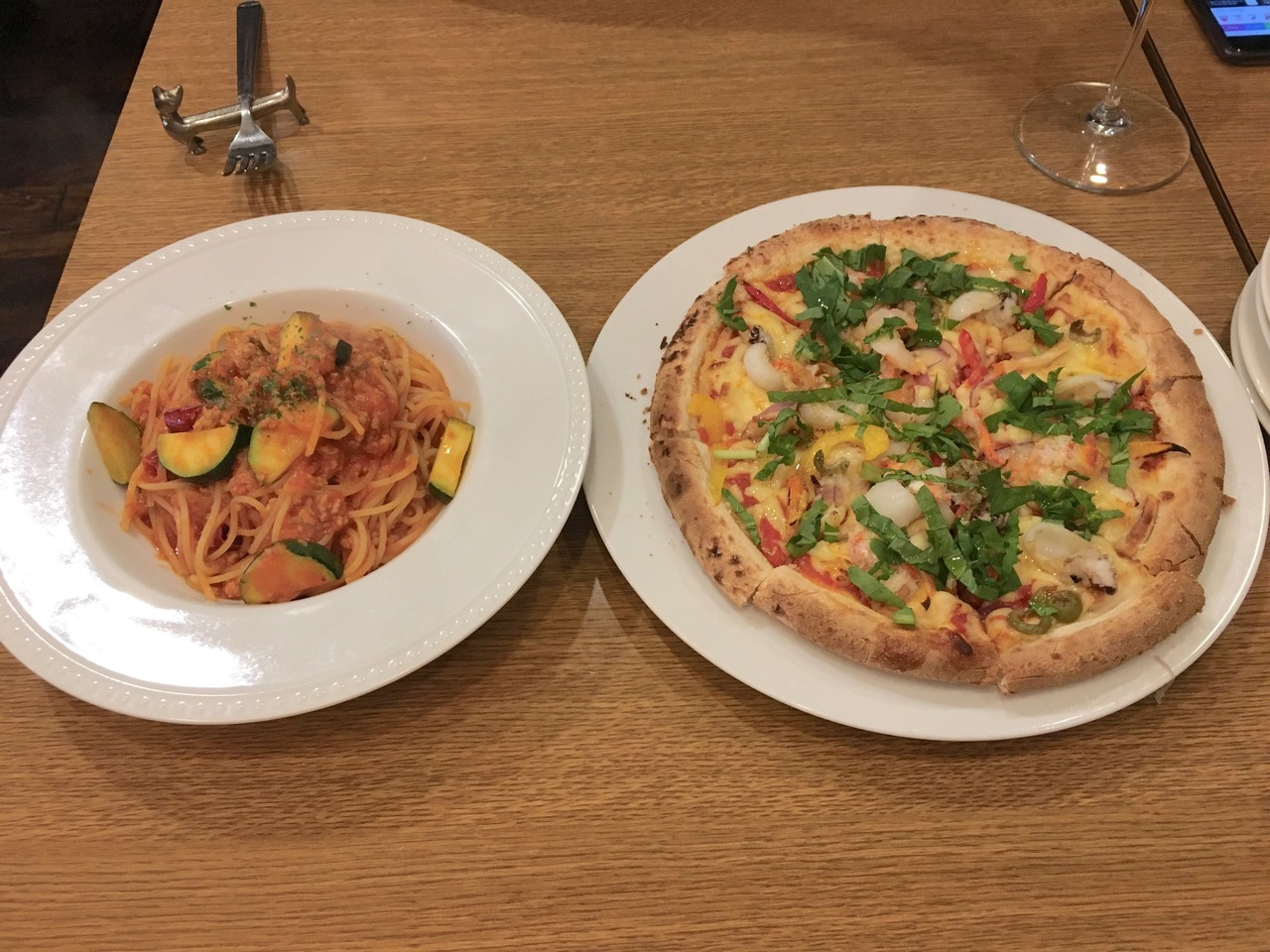 今回、岩手の「ベアレン」というクラフトビール(アルトとシャバルツ)を頂きながら、ランチのパスタセット(群馬産ポークとズッキーニのアラビアータ)とピザセット(カプリチョーザ/今回は魚介メインのピザ)をオーダー。