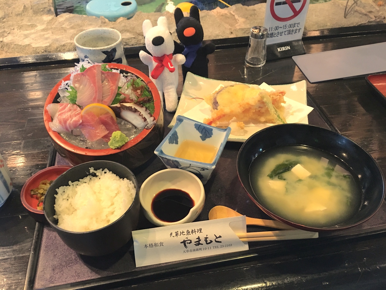 「天草御膳」は、刺身、天ぷら、茶碗蒸し、お味噌、ご飯、香の物がセットになっていまして、お味はどれも美味しかったです。
