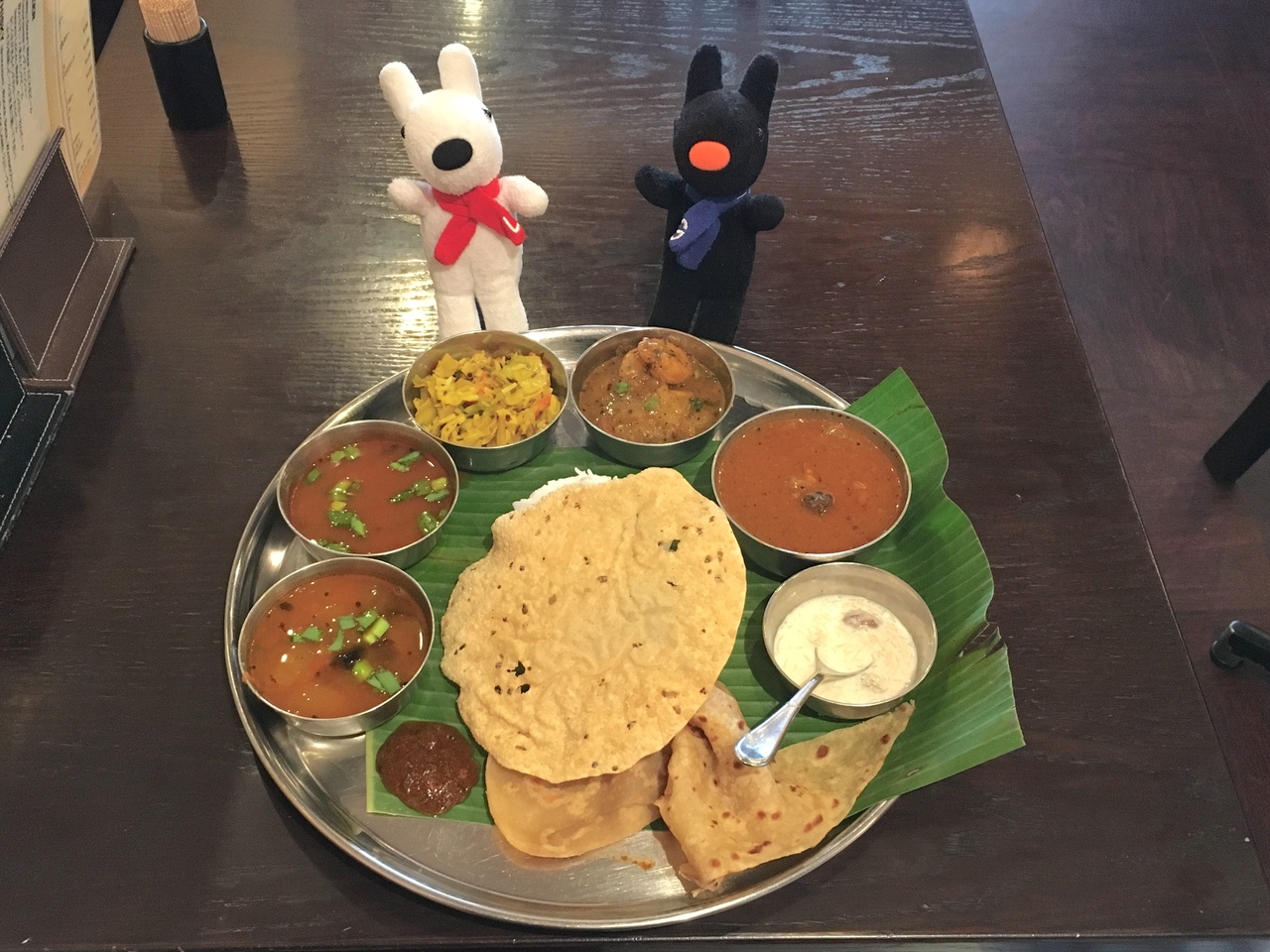 チキンカリー、エビ炒め、サンバル、ラッサム、ポリヤル(野菜炒め)、チャパティ、ライス、ピクルス、デザート(セミヤ・パヤサム?)がセットになっていました。