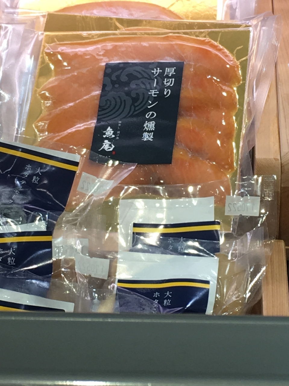 店頭には色んな魚の加工品が並んでいまして、今回、厚切りサーモンの燻製を購入。