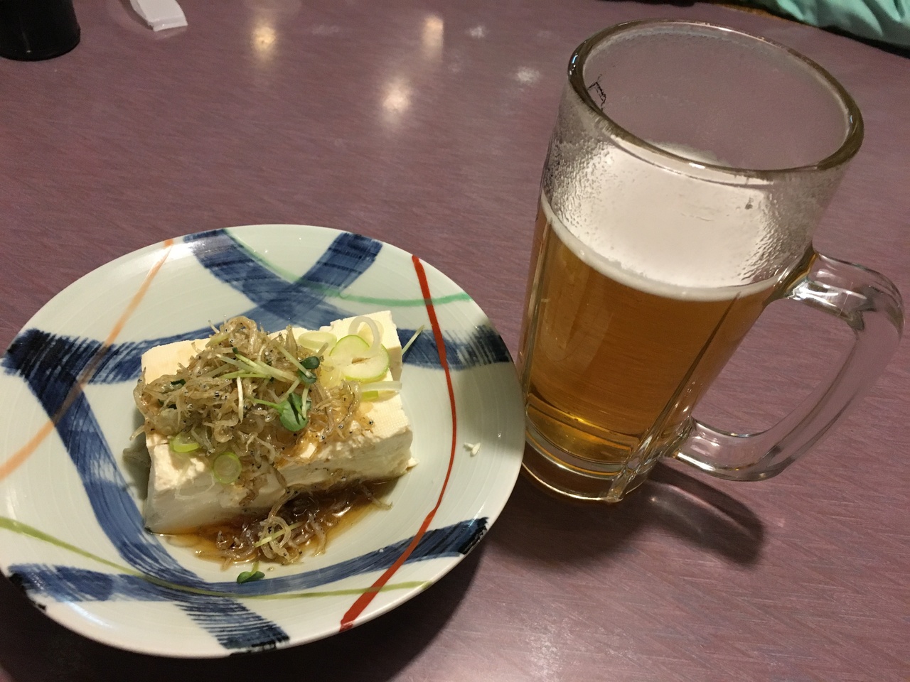 今回、ビールを飲みながら、スンドゥブ定食、小松菜を炒めた物、じゃこが乗った豆腐などをオーダー。
