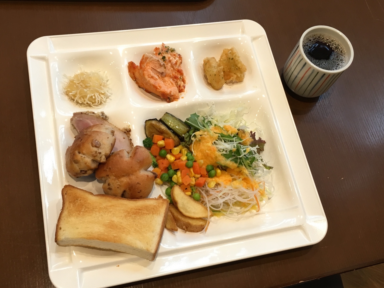 ビュッフェの内容は、サラダバー、カレー、サーモンのムニエル、煮物など。