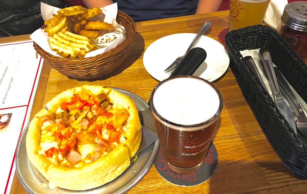 この日、シカゴピザとポテトオニオンリングを食しながら、何種類かのビールをハーフでオーダーし飲み比べ。