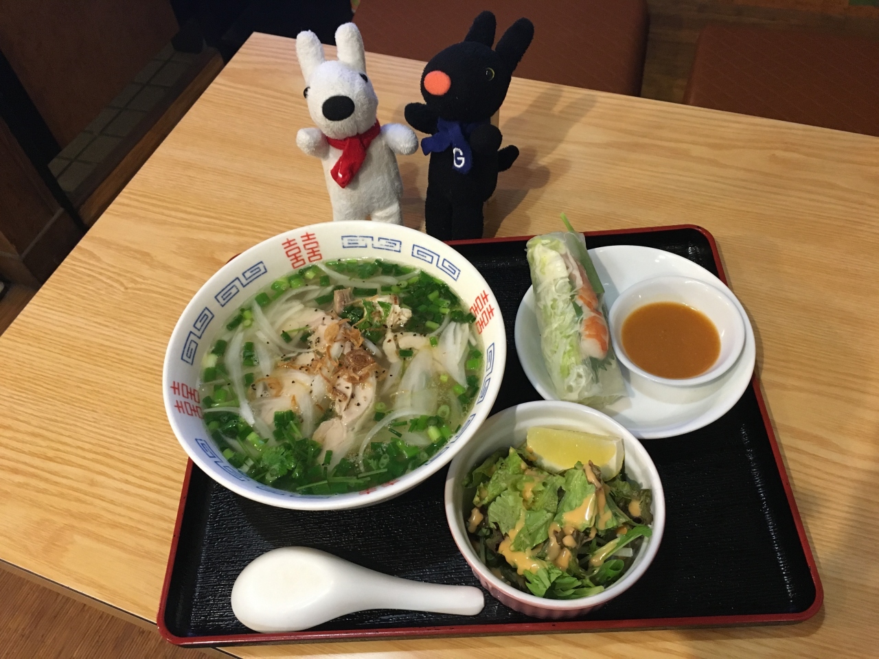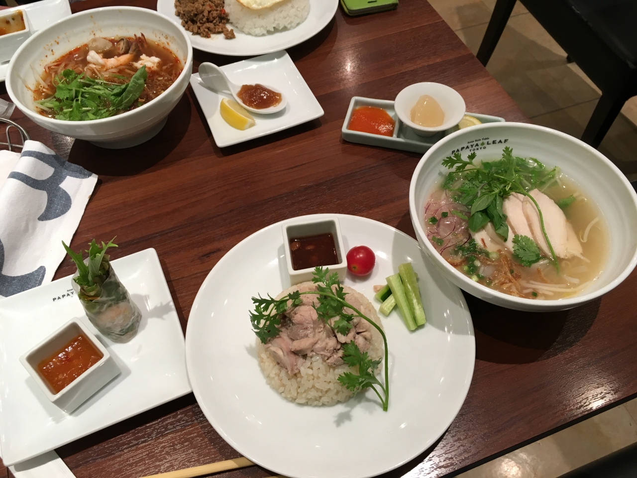 カオマンガイとフォー(フォーは2種類から選べる)のセットと、ガパオライスとフォー(こちらも2種類から選べる)のセット。どちらも\1500弱。生春巻き付きでした。