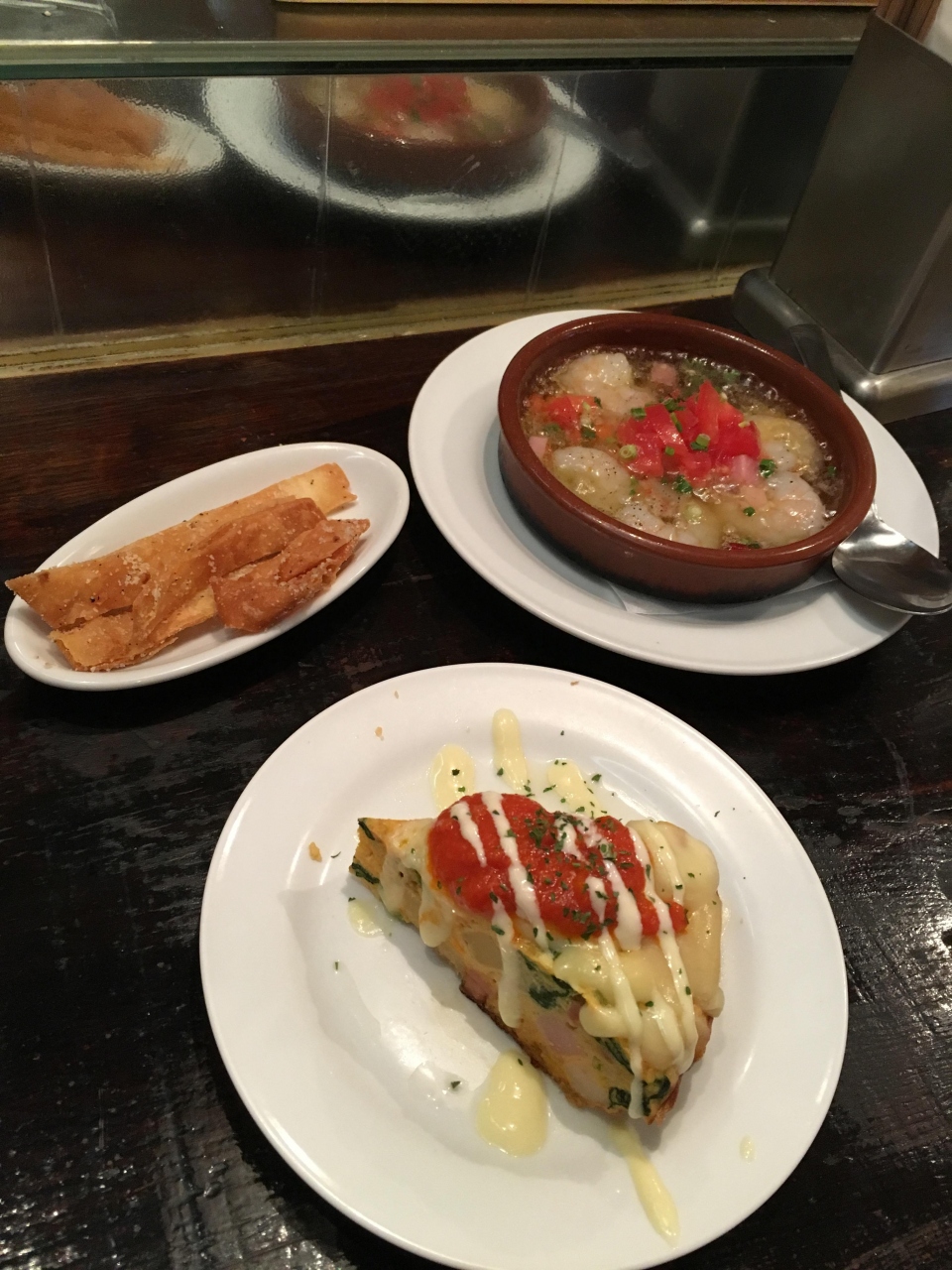 今回、カールスバーグやワインと一緒に、海老のアヒージョ、トルティージャ、カプレーゼ風のサラダなどをオーダー。