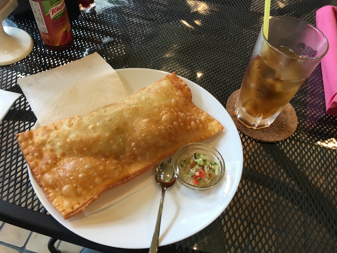 塩気のある大き目の餃子の皮(?)の中に、香草とターメリック(?)風味のヤシの新芽、オリーヴが入っていまして、カラリと揚げてありました。特に可もなく不可もなく...な、お味でした。