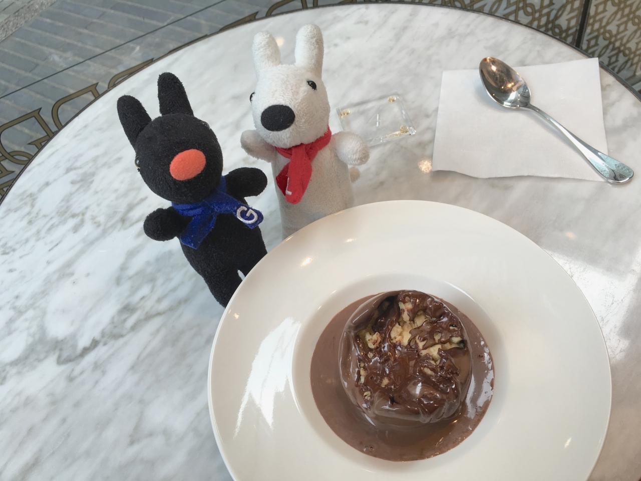 ボール型のチョコレートの中に、ヴァニラビーンズの風味豊かなアイスと、クランブルが入っていて、スタッフがショコラショーをかけて下さいます。