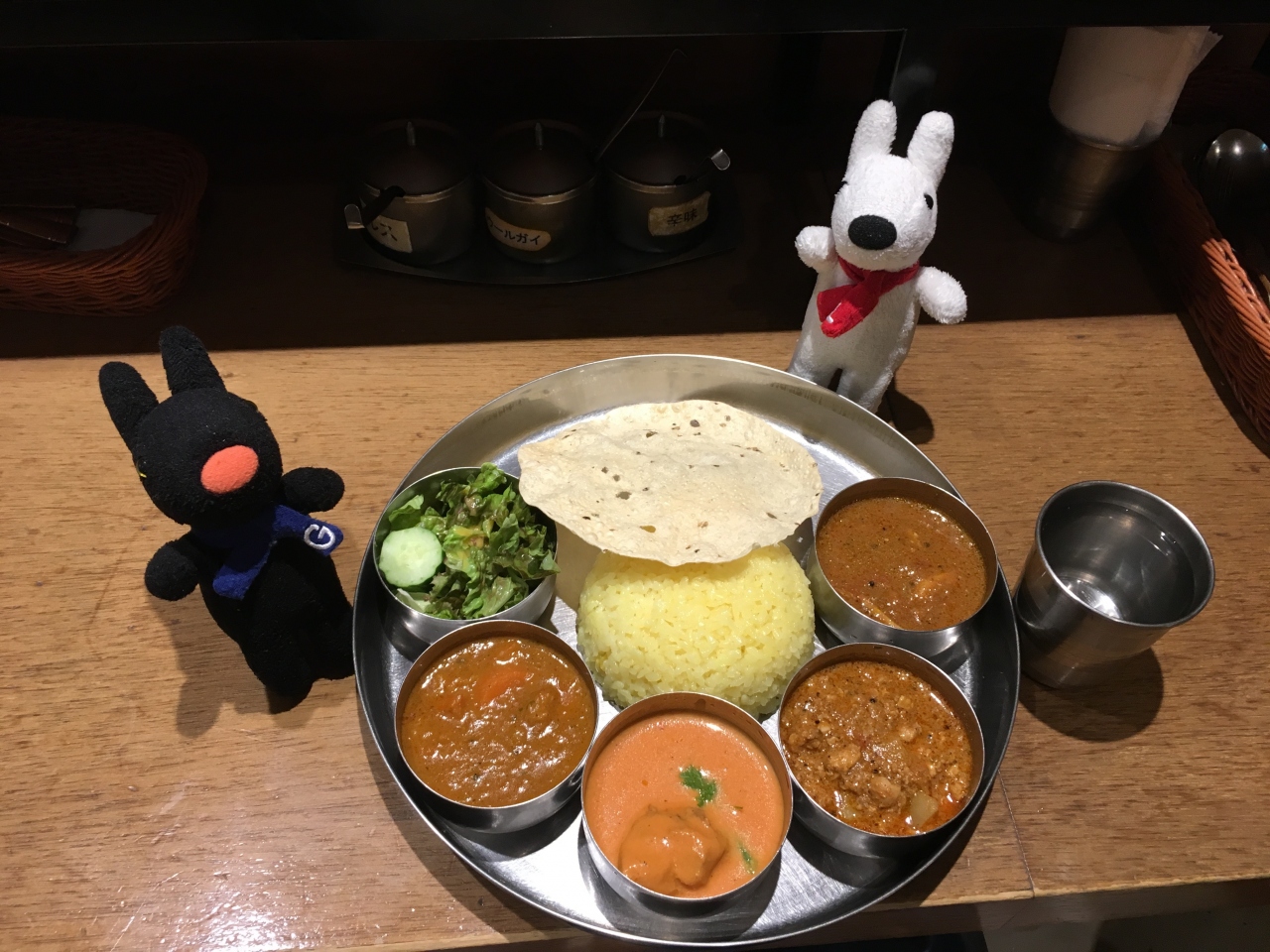 今回『バラエティランチ』をオーダー。カレー4種とターメリックライス、パパド、サラダ又はヨーグルト。