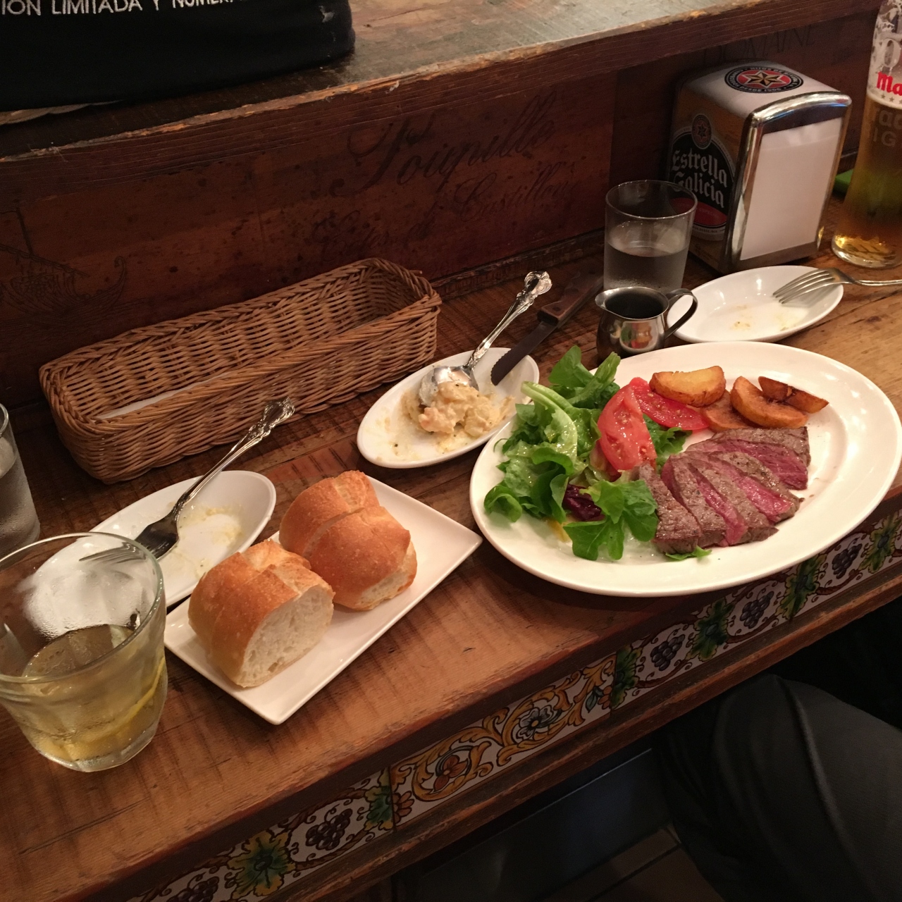 今回私達は1Fでタパスをつまみながら、お酒を頂きまして、白ワインベースのサングリア(期間限定だそう)、スペインのビール、ポテサラ、ステーキ、小エビのアヒージョなどをオーダー。