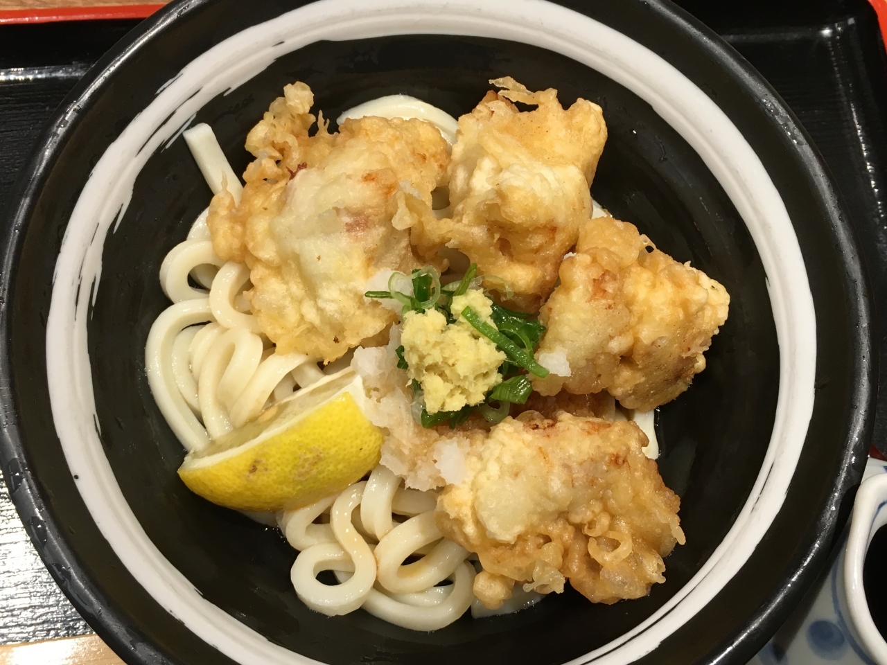 今回、冷うどんにとり天が乗ったものを頂きまして、大根おろしと生姜をすった物、レモンが添えられていて、さっぱりとしてました。