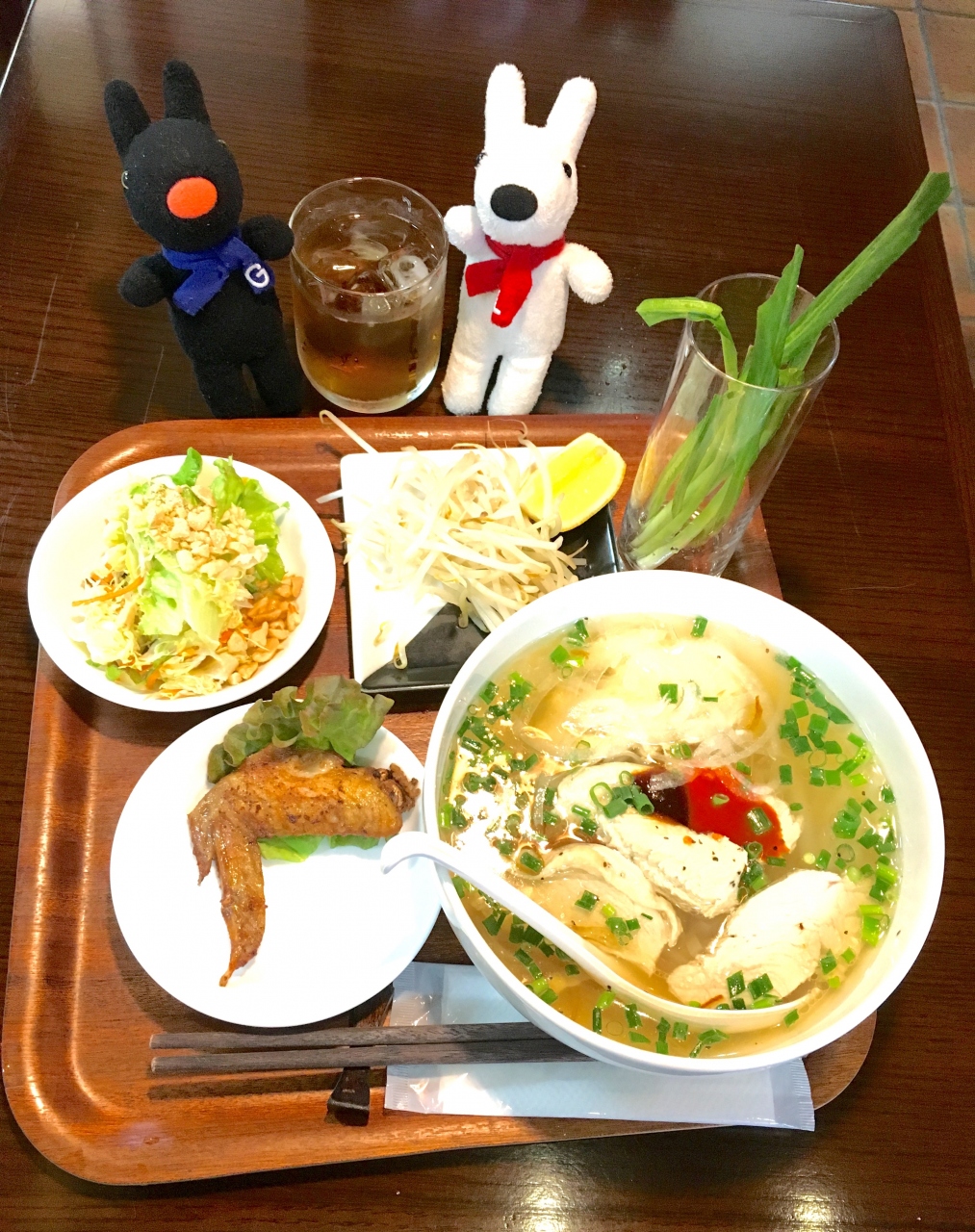 今回、ランチセットの鶏肉のフォーをオーダー。手羽先とサラダが付いていました。