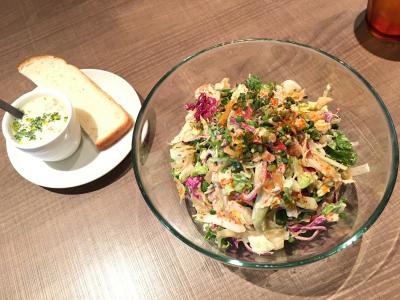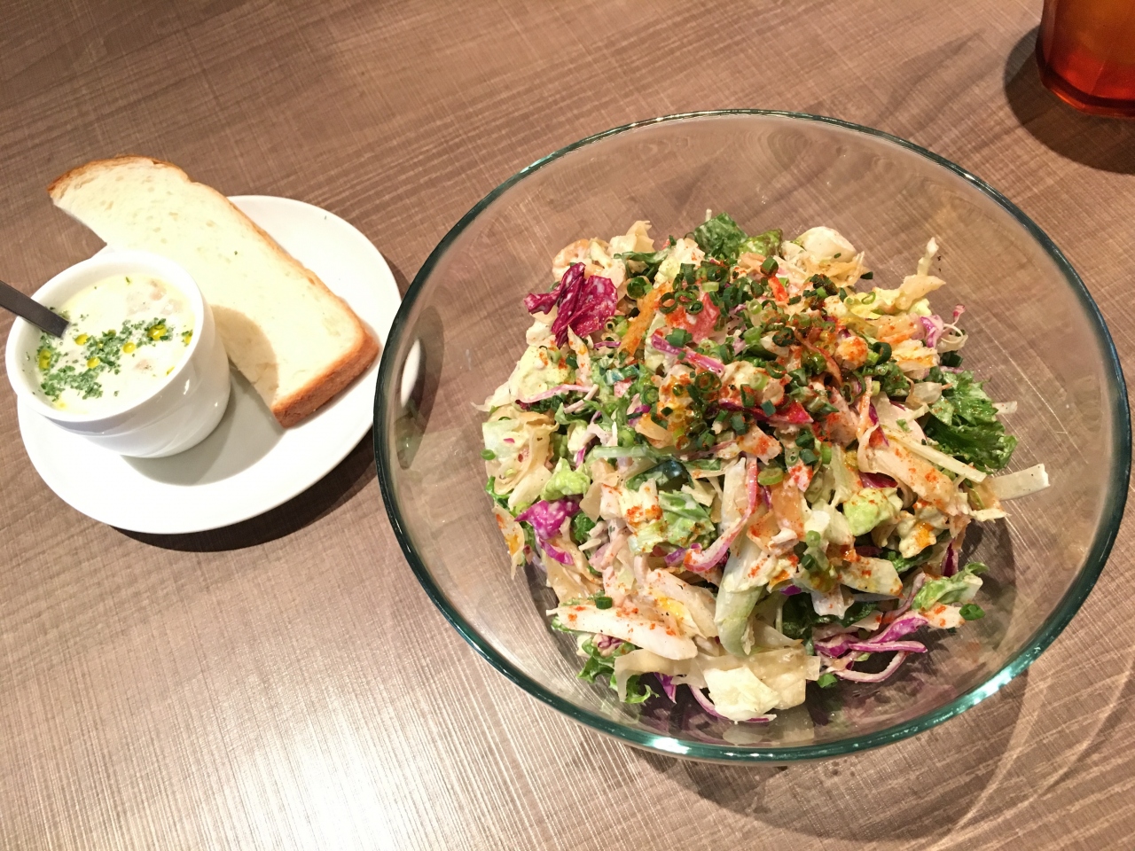 大きなガラスのボウルに、鶏肉&レタス&トレビス&(多分)水菜&トマト&人参&(多分)春巻きの皮を揚げた物&玉ねぎなどの野菜を、(多分)マヨネーズとパプリカパウダーで和えた物と、スープ、パンが付いていまして、サラダが美味しく、量が多かったのですが、ペロリといけました。